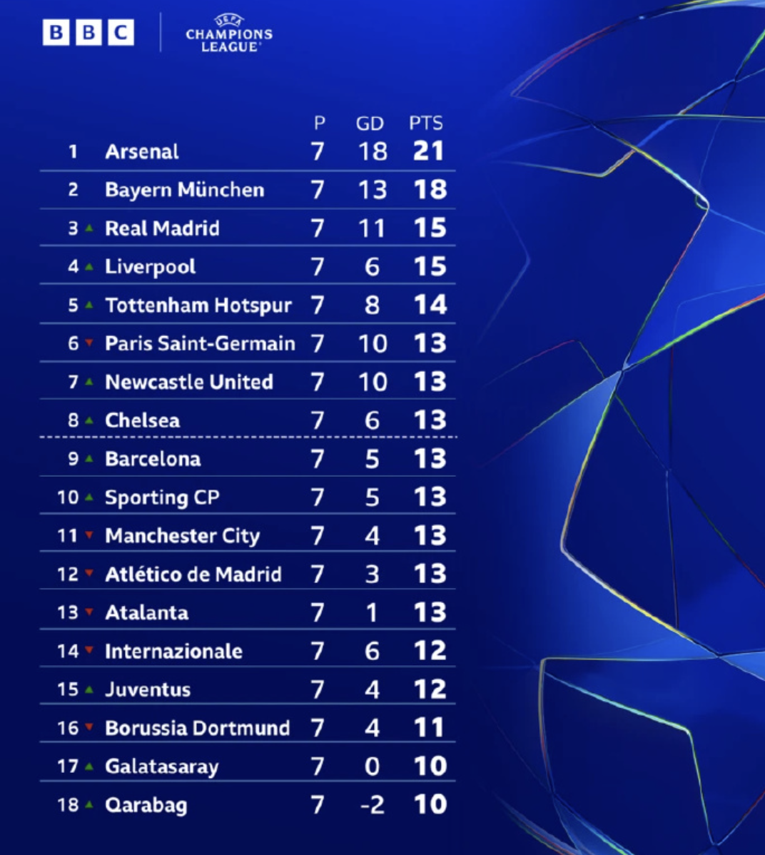 7轮过后,积分榜上是几家欢喜几家愁。阿森纳7战全胜,独自领跑,拜仁6胜1负,排名第2,这两支球队都确定直通16强。随后,第3-8名依次是皇马、利物浦、热刺、巴黎、纽卡以及切尔西,他们都暂时处在直通区。